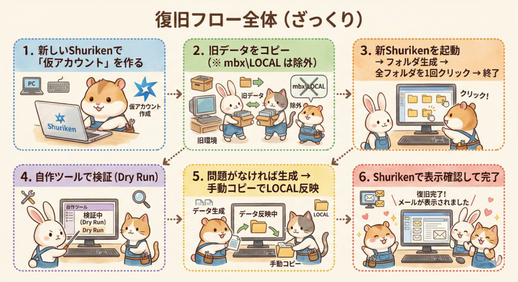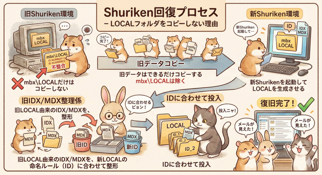 Shuriken(手裏剣)のメール復旧って、情報が断片的で「結局どこをどう触れば戻るのか」がまとまってないことが多いです。今回、旧データを新しいShuriken環境に復旧する必要があり、ゼロから構造を掘り直して手順化しました。