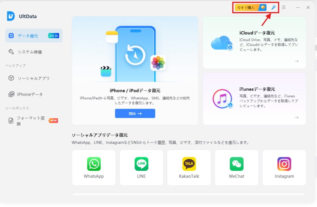 アプリを起動すると、UltData for iOS のメイン画面が表示されます。まず最初に行うのが、ライセンス登録です。