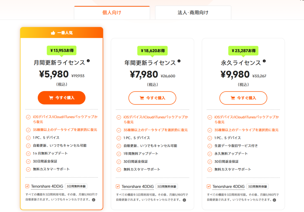復旧作業を行うたびに、この iPhone台数がカウントされていく仕組みです。家族で複数台使う場合や、6台以上のiPhoneを扱う予定がある場合は、この点だけ注意が必要です。