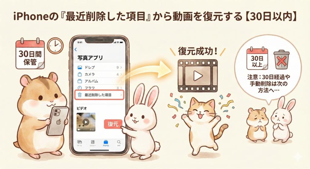 方法1.iPhoneの「最近削除した項目」から消した動画を復元する【30日以内】