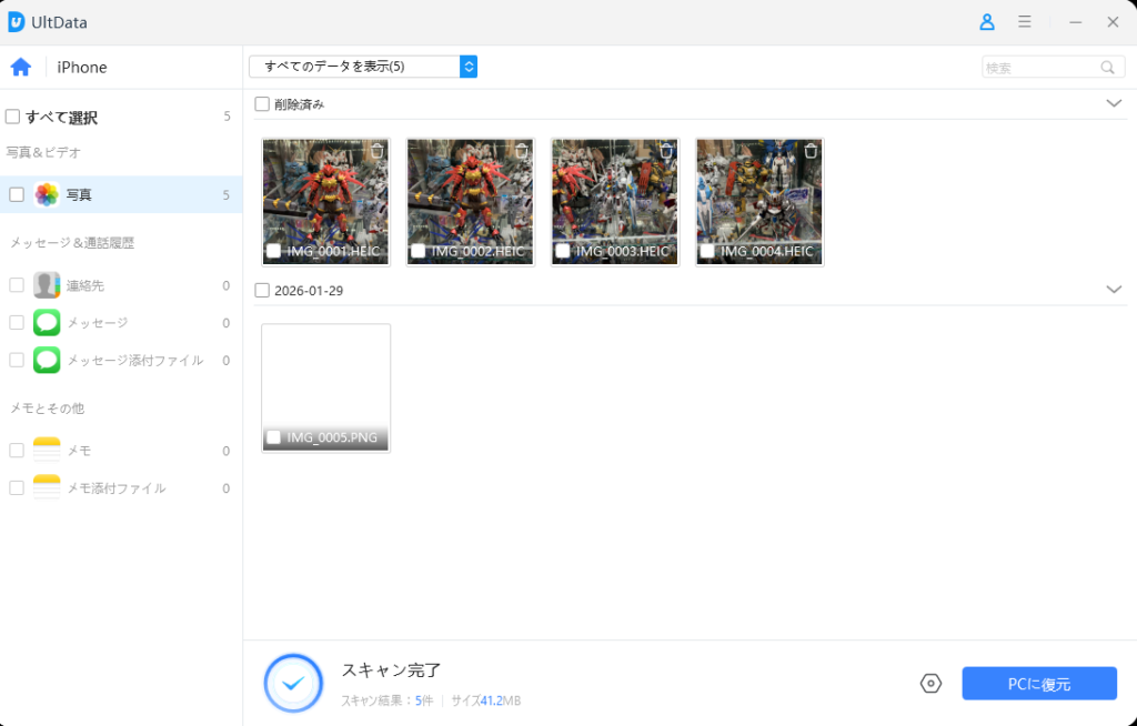 スキャンが完了すると、削除した写真がすべて一覧に表示されました。