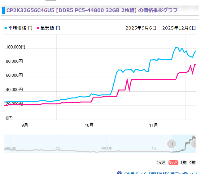 最近、メモリの値段を見て「眼鏡の度数が合わなくなったかな?」と疑ったことはありませんか?私はあります。32GBのキットが数ヶ月前の倍近い値段になっているのを見て、そっとブラウザを閉じました。