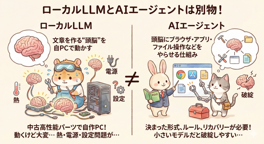 理由は単純で、ローカルLLMは“動く”と“実用”が別物だからです。動いた瞬間は感動する。でも、仕事で使い続けようとすると急に粗が出る。遅い、忘れる、崩れる、言うことを聞かない。ここが辛い。