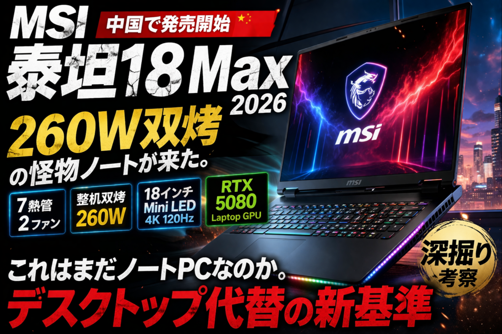 今回目に入ってきたのは、MSIの「泰坦 18 Max 2026」という中国向けの販売情報です。数字だけ見てもかなり強烈で、7熱管に2ファン、整機双烤260W、18インチ級の大型筐体。こういう言葉が並ぶと、つい「うわ、すごいな」で終わってしまいそうになるのですが、個人的には、今回はそこだけでは終わらせたくない話だと思いました。