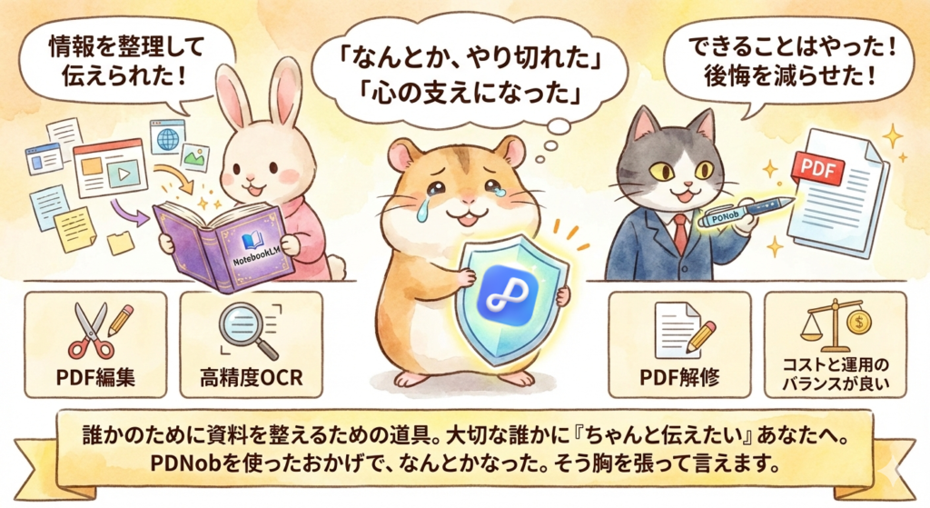 そう思えるだけで、心の支えになりました。NotebookLMで「作り」、PDNobで「整える」。この流れがあったからこそ、私は 「なんとか、やり切れた」 と感じています。