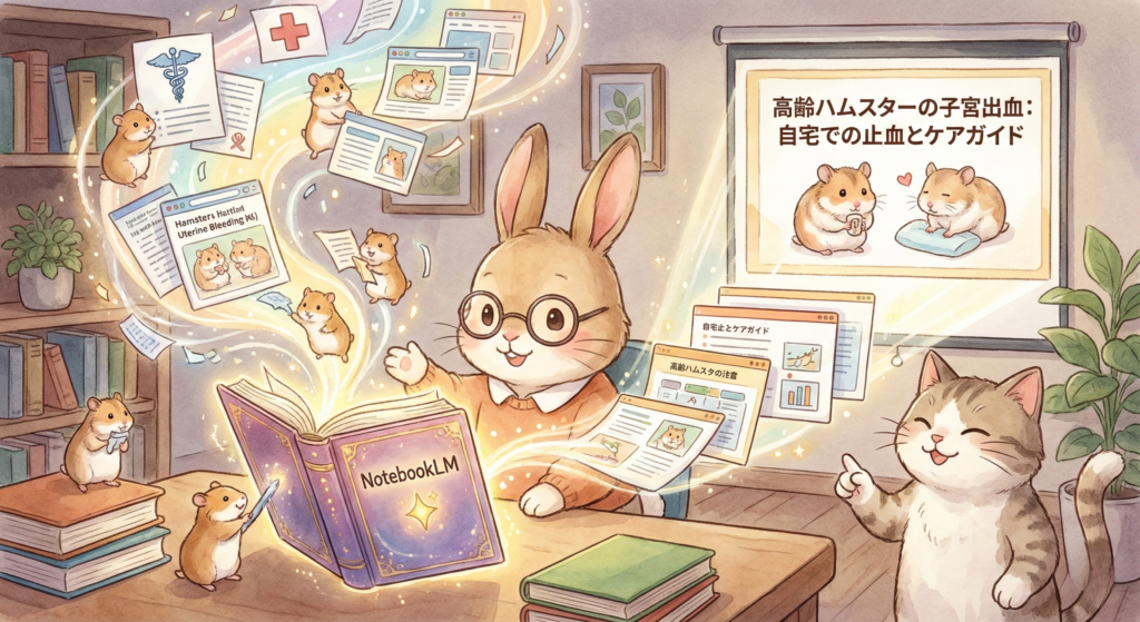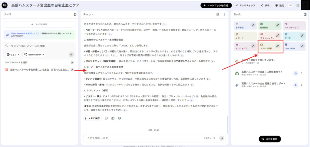 今回は例として、自宅で飼っている高齢のハムスターについて、「出血が見られた場合の対応」をNotebookLMに問いかけ、その内容をスライド資料としてまとめました。