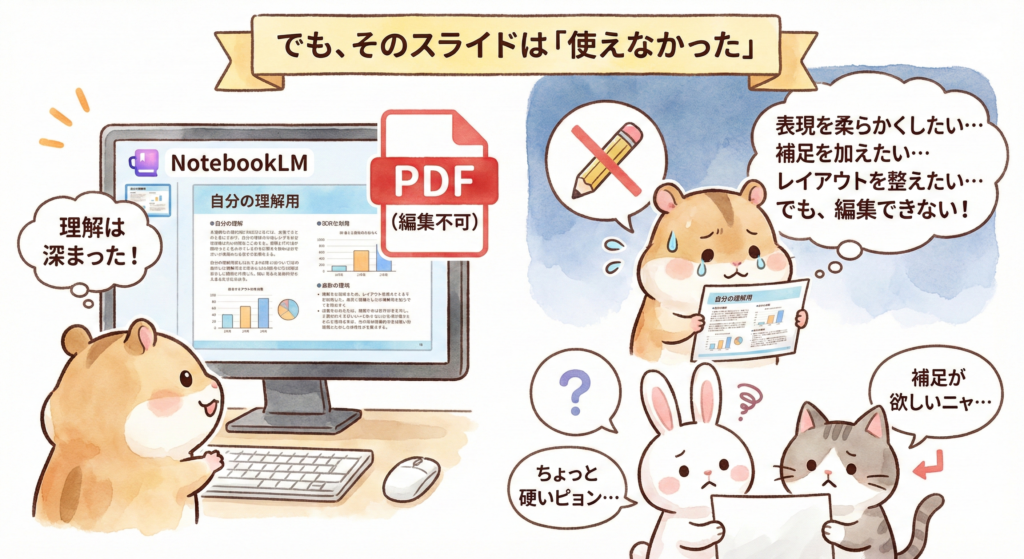 そう思っても、PDFとして出力されたスライドは、簡単には編集できませんでした。