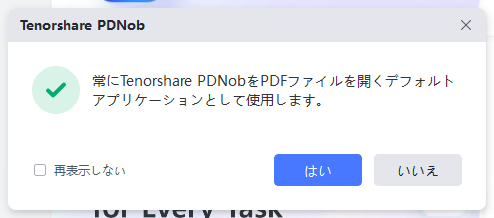 インストールが完了すると、「今後、PDFファイルを開く際にPDNobを既定のアプリとして使用しますか?」という確認画面が表示されます。