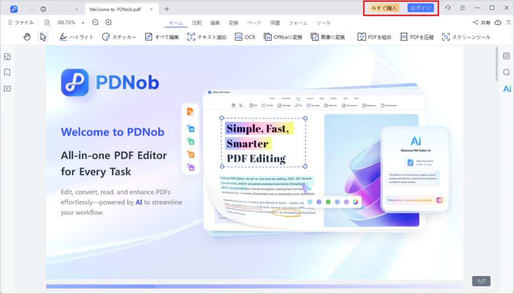 この時点で、PDNobは通常のPDF閲覧・編集ツールとしてすぐに使える状態になります。まずは「普通のPDFを開くツール」として使い始めても全く問題ありません。