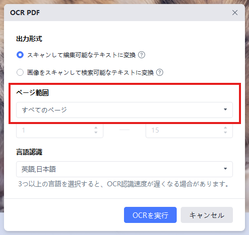 OCR実行時の設定で、特に注意したいのが ページ範囲 です。