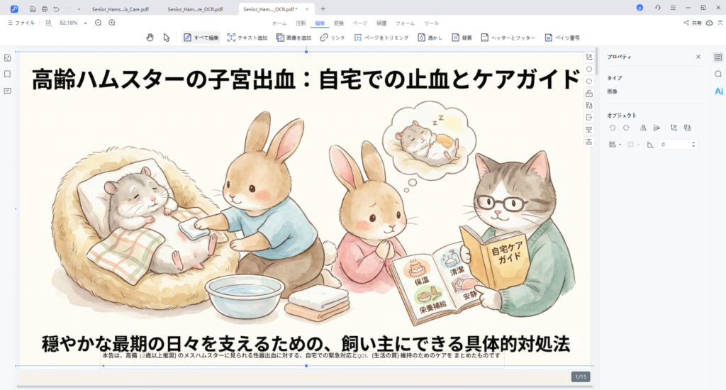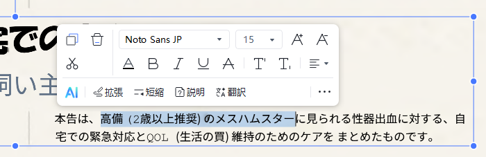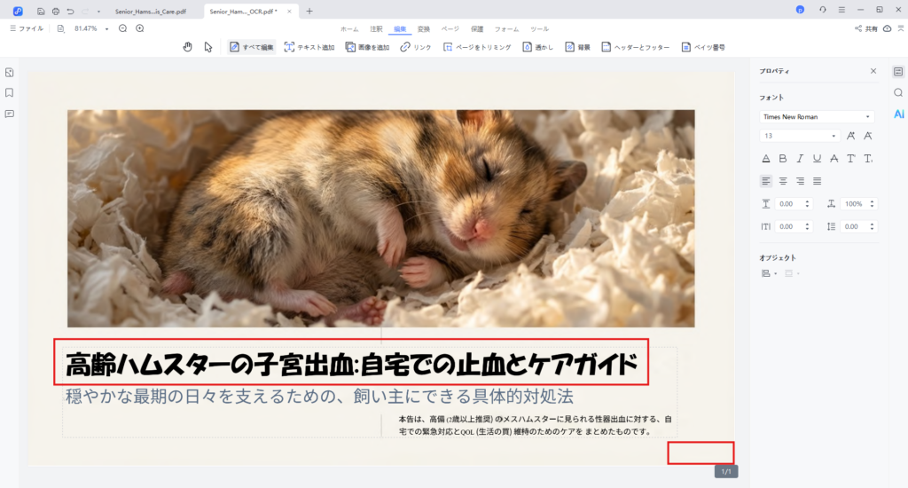 「高齢ハムスターの子宮出血」というタイトルですが、この部分は フォントの種類やデザインを自由に変更できます。PDFでありながら、