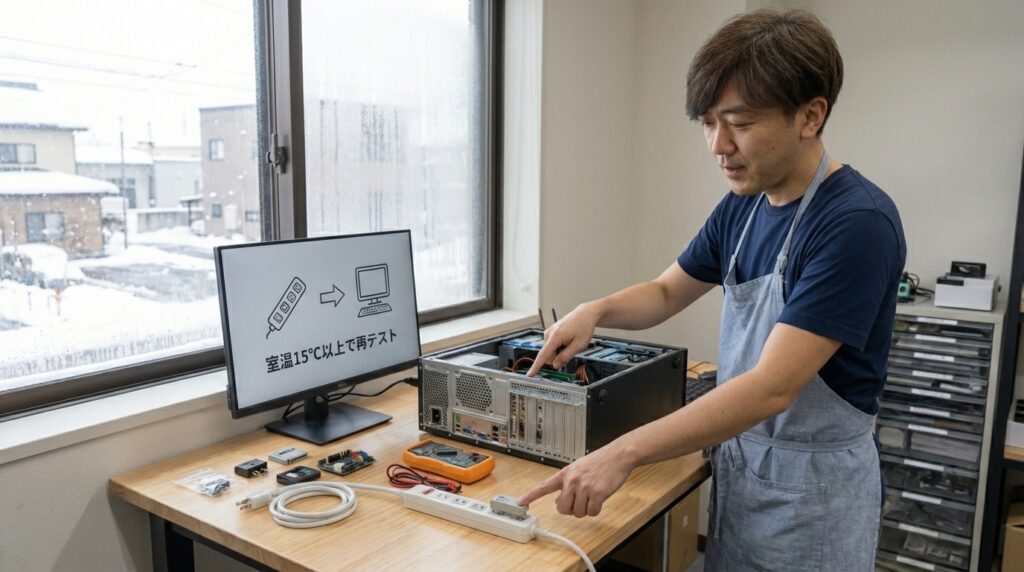 パソコンって、基本的には「寒冷地仕様」で作られているわけではありません。例えば10℃以下みたいな環境だと、条件が重なったときに起動が渋くなるケースがある。