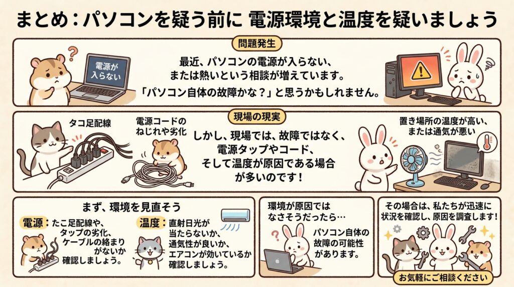 まとめ:パソコンを疑う前に「電源」と「温度」を疑ってください