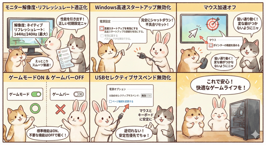 こうした相談の原因が、USBセレクティブサスペンドであるケースは珍しくありません。ゲーミング用途では、安定性優先で無効化しておく方が安全です。