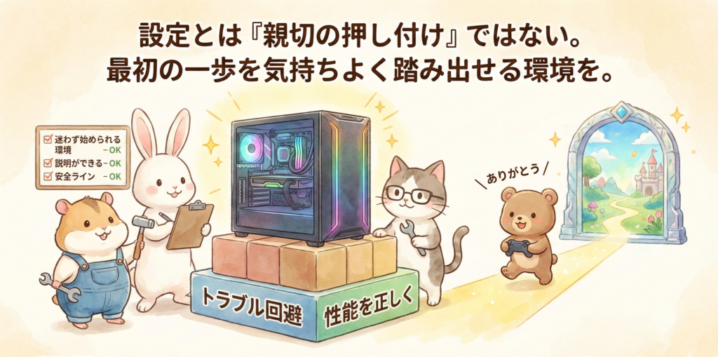いわば、修理屋・設定屋の“安全ライン”です。これからPCゲームを始めるお客様にとって、最初の一歩を気持ちよく踏み出せる環境を整えること。それこそが、専門業者にしかできない価値だと言えるでしょう。