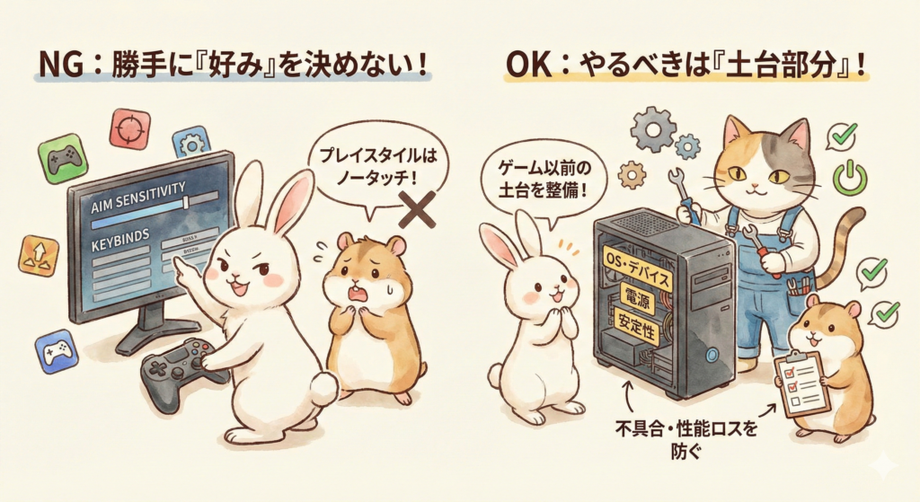 まず大前提として、エイム感度・ゲーム内設定・キー割り当てなど、プレイスタイルに直結する部分は原則ノータッチが鉄則です。業者が触るべきなのは、