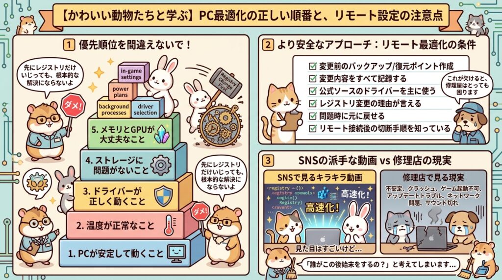 画面が次々切り替わって、黒い画面が出て、レジストリが開いて、設定が高速で変わる。見ていると、なんだかすごいことをしているように見えます。ですが、修理現場で見るのはその後です。ゲームが不安定になった、配信ソフトが落ちる、別のゲームだけ起動しない、Windows Update後に変になった、ネットワーク周りが怪しい、音が飛ぶ。こういう“副作用”の相談が現実には出てきます。だから私は、この手の動画やサービスを見ると、「派手だけど、後始末は誰がするんだろう」と先に考えてしまいます。