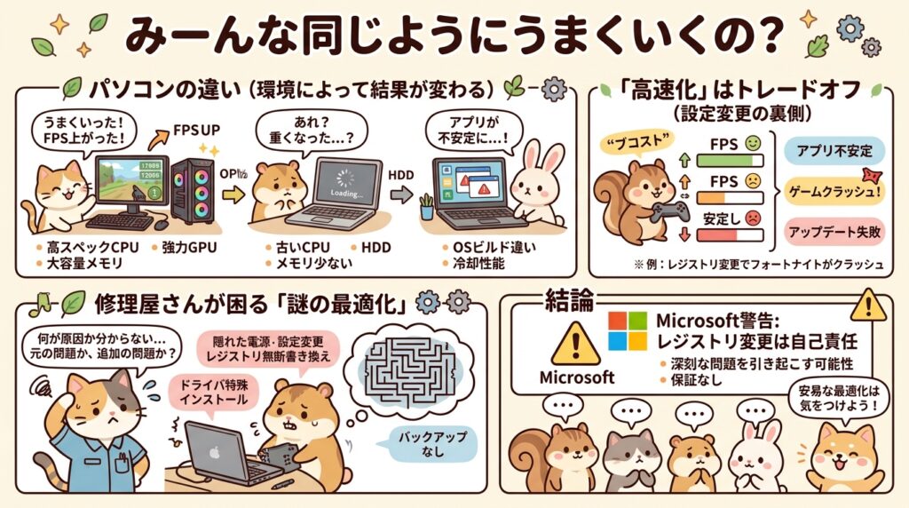 Windowsのビルド、入っている常駐ソフト、マザーボードの制御、電源プラン、冷却状態まで全部違います。つまり、ある1台で効いた設定が、別の1台では逆効果でも何もおかしくありません。Microsoft自身も、レジストリの誤った変更は深刻な問題を起こし、最悪はOS再インストールが必要になると警告しています。