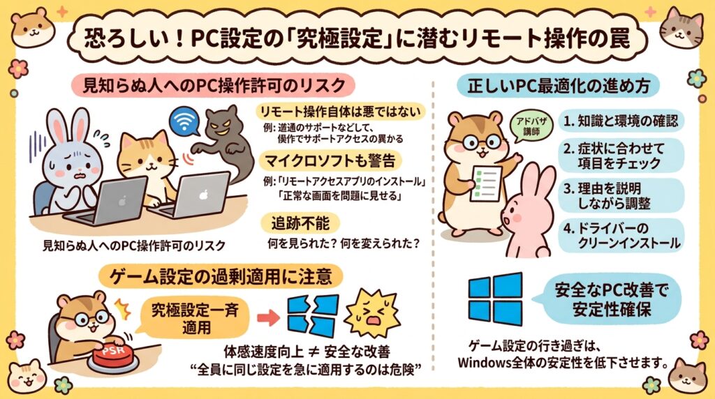 本当に知識があって、依頼者の環境を見たうえで、理屈を説明しながら調整している人もいるかもしれません。実際、ドライバーのクリーンインストールや不要要素の見直し自体は、場面によって有効です。けれど、それは本来、症状や構成を見ながら一つずつ確認してやるものです。誰にでも同じ“最強設定”を入れるような話ではありませんし、まして遠隔で一気に流し込むなら、なおさら危ないです。