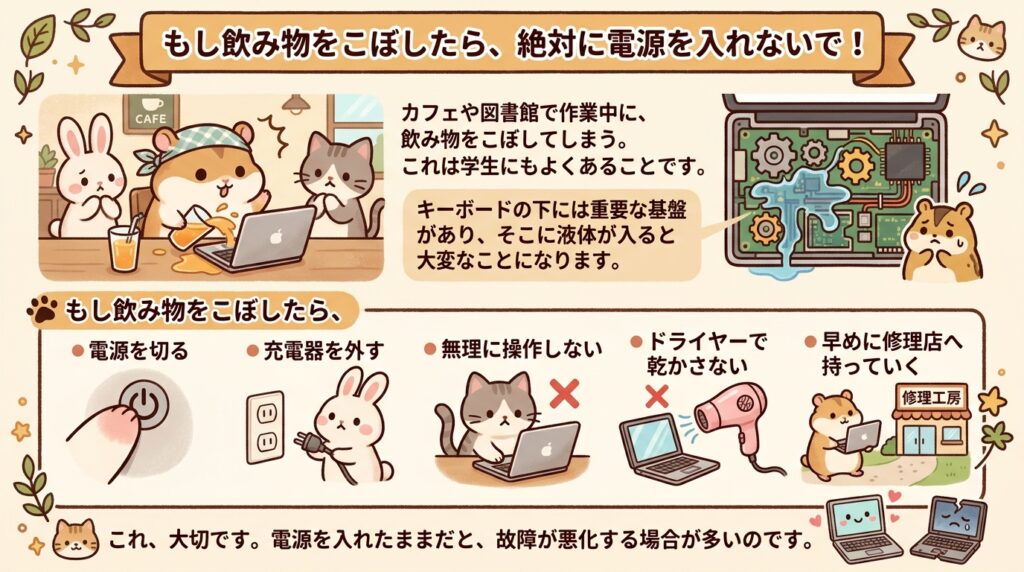 カフェや図書館で作業していて、飲み物をこぼす。これも学生さんには本当に多いです。キーボードの下には大事な基板があるので、ここに液体が入ると一気に重症化します。