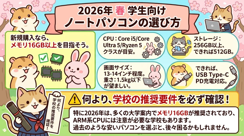 特に2026年は、大学側の案内でもメモリ16GB推奨がかなり増えていますし、学校によってはARM系CPUに注意が必要なケースもあります。昔と同じ感覚で「とりあえず安いノートでいいかな」と選ぶと、あとで不便が出る可能性があります。