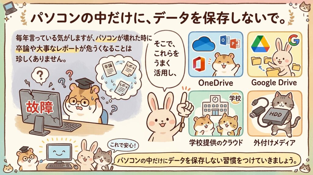 これは毎年のように言いたくなることですが、卒業論文や大事なレポートが、パソコン故障と一緒に危機に陥るケースは珍しくありません。