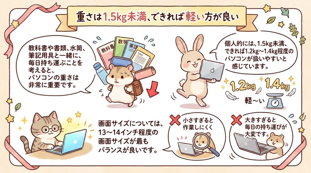 画面サイズとしては、13インチから14インチ前後が一番バランスがいいです。小さすぎると作業しづらく、大きすぎると毎日の持ち運びがしんどくなります。