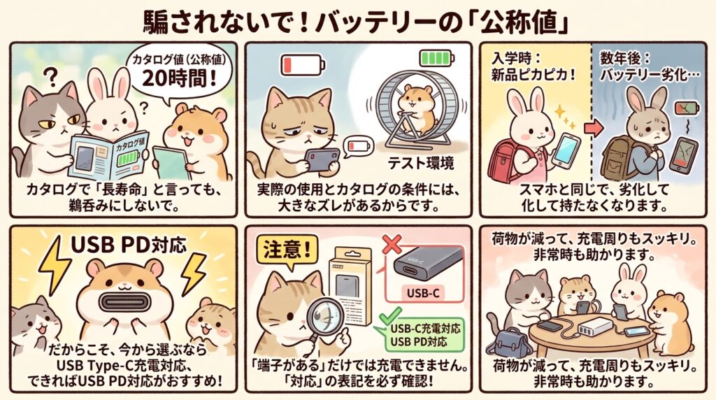 しかも、バッテリーはスマホと同じで少しずつ劣化していきます。入学した頃は問題なくても、数年経つと持ち時間が目に見えて落ちてくることがあります。