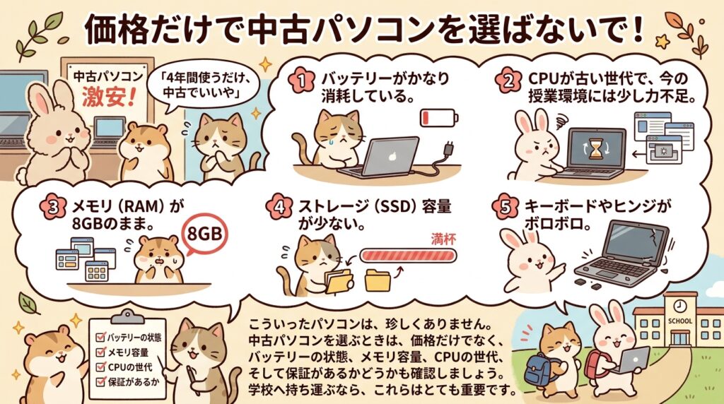 「4年だけ使えればいいから中古でいいかな」と考える方もいます。もちろん中古が全部ダメというわけではありません。ただし、安価な中古の中には、
