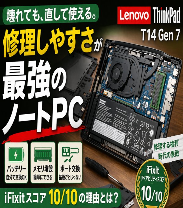 - ThinkPad T14 Gen 7 は iFixit との共同設計で、ノートPC 史上初の修理スコア10点満点を獲得。