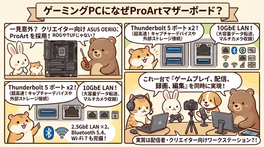 ただし、単純なGPU比較だけで判断するのは早計だ。今回のマシンはProArtマザーによるThunderbolt 5×2や10GbEを標準装備しており、これらをあとから追加しようとすると拡張カードやスイッチング機器で相応のコストがかかる。配信・制作環境としてトータルで組もうとしたとき、価格差は縮まる。