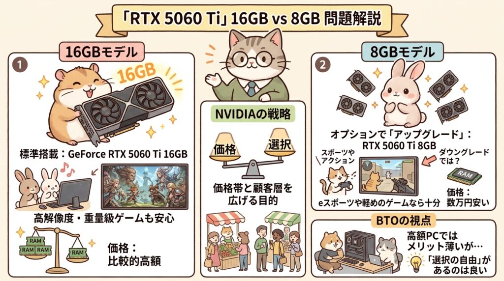 この背景にはNVIDIAのRTX 5060 Ti販売戦略がある。RTX 5060 TiはVRAM容量が異なる8GBと16GBの2バリアントが存在しており、価格差は数万円規模になる。NVIDIAがこのような構成を取った理由については、価格帯を広げて購入層を広げる意図があるとみられているが、ゲーム用途でVRAM 8GBが十分かどうかはタイトルによって大きく変わる。