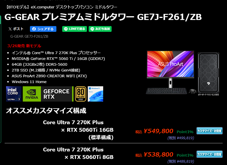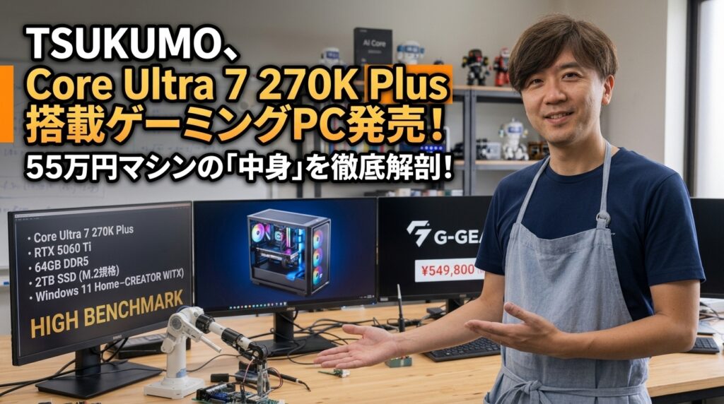 2026年3月27日、ヤマダデンキ傘下のTSUKUMOが、G-GEARシリーズの新モデルを2機種発売した。搭載CPUはIntelの「Core Ultra 7 270K Plus」、価格は549,800円と597,800円。ゲーミングPCとしては相当ハイエンドの部類に入る価格帯だ。