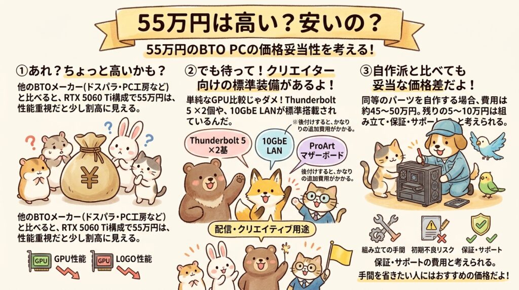 自作との比較では、同等スペックのパーツを揃えると部品代だけで45〜50万円程度になる計算だ。残り5〜10万円がTSUKUMOの組み立て・保証・サポートコストと見ることができる。自作の手間や初期不良対応のリスクを嫌うユーザーにとっては、許容範囲内の上乗せといえる。