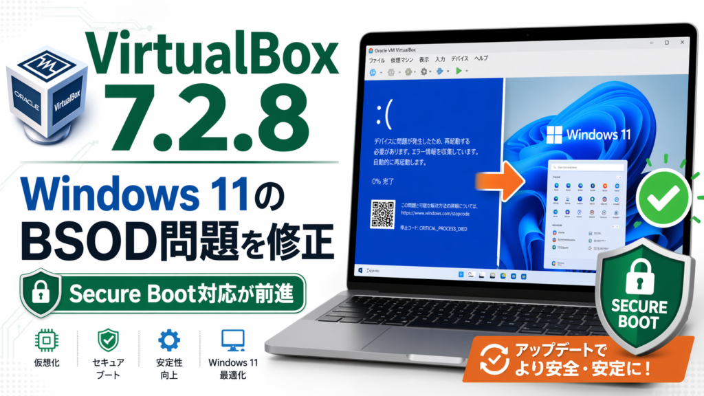 VirtualBoxの新バージョン7.2.8がリリースされ、Windows 11を仮想マシンで動かす時に発生していたブルースクリーン(BSOD)の問題が修正されました。これは仮想環境を使ってシステム検証やテストを行う方にとって、結構重要なアップデートなんです。