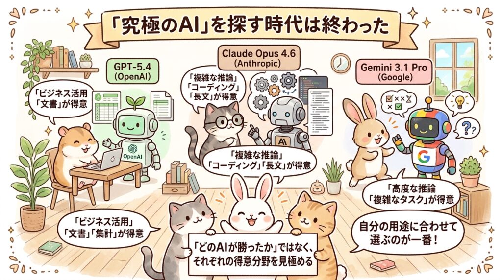 OpenAIは2026年3月に GPT-5.4 を発表し、Anthropic は 2026年2月に Claude Opus 4.6 を案内、Google も 2026年2月に Gemini 3.1 Pro を公開しています。