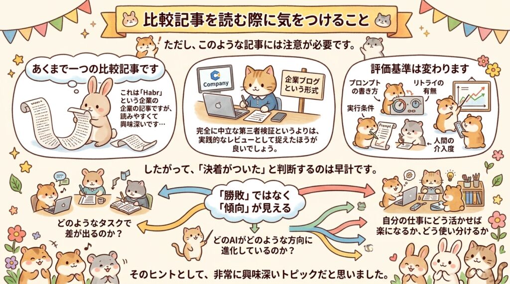 今回のHabrの記事は、かなり読みやすくて面白い内容でしたが、あくまで1本の比較記事です。しかも企業ブログ形式なので、完全に中立な第三者検証というよりは、実用レビュー寄りに見たほうがいいでしょう。評価基準も、プロンプトの書き方、実行条件、再試行の有無、どこまで人が手直ししたかで変わってきます。