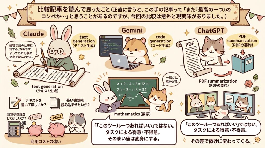 AIの比較記事を見ると、どうしても「勝ったのはどれか」という見方になりがちです。でも実際には、仕事で使う側からすると、そんなに単純ではありません。