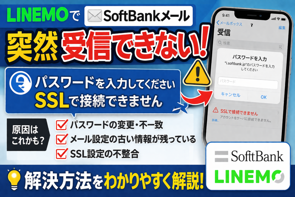 SoftBankはiPhoneのメール設定でSSL利用を前提に案内しています。旧設定や情報の不整合があると、パスワード自体は正しくても接続段階で弾かれてしまい、「SSLで接続できません」や「パスワードが正しくありません」という表示に見えることがあります。
