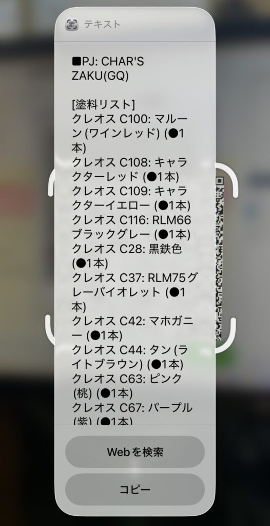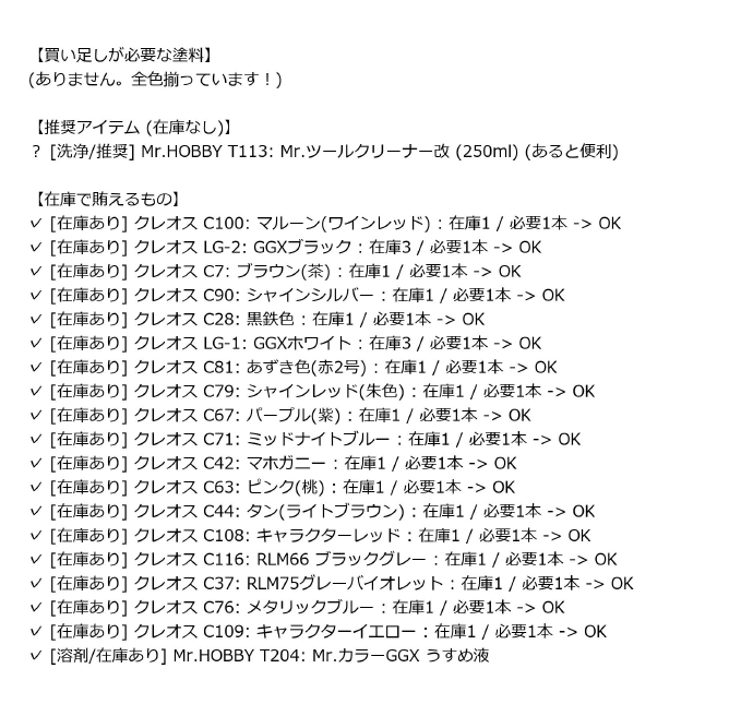 こちらは 買い物用PDF です。在庫状況をもとに、今回の制作で足りない塗料だけを一覧化してPDF出力します。模型店・プラモデル屋さんに行くときは、この紙を持って行くだけ。もうメモ帳も、スマホのメモアプリも要りません。