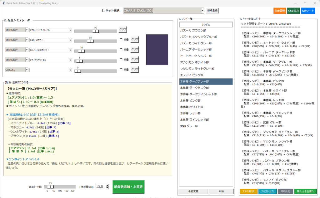 制作中に「あ、この色もう無いな」と思ったら、その場で −1。次に必要な塗料は、自動的に「買うもの」として抽出されます。