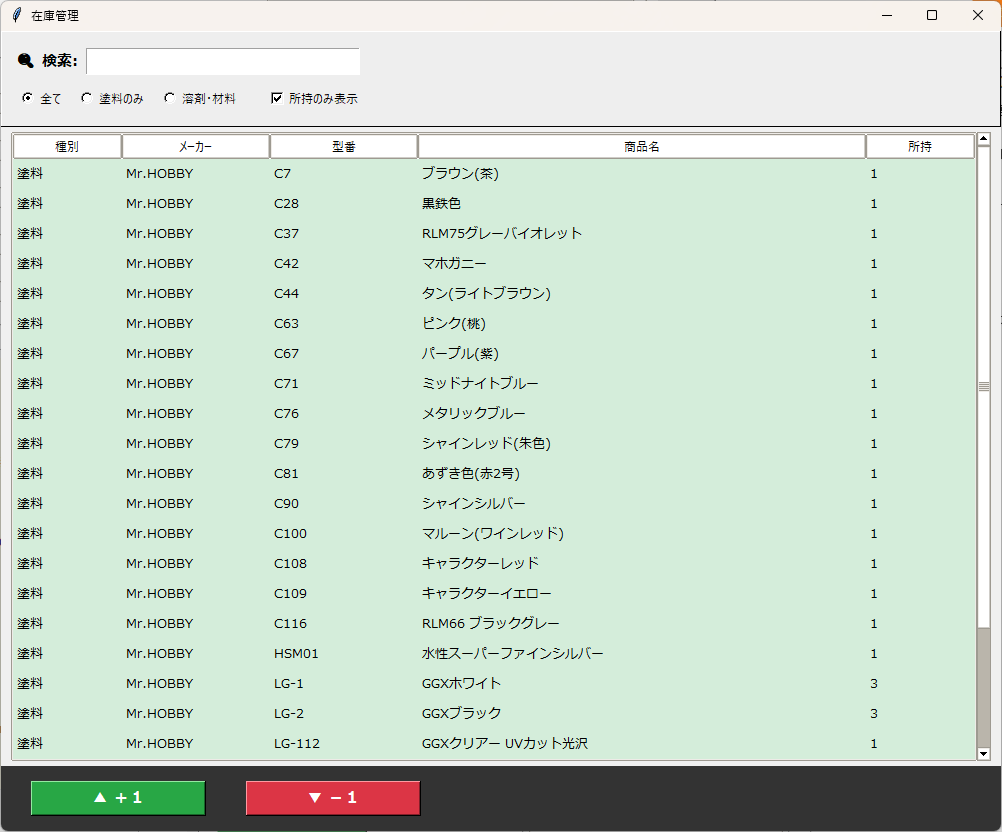 これが在庫管理画面です。持っている塗料を、+ / − ボタンで増減させるだけ。