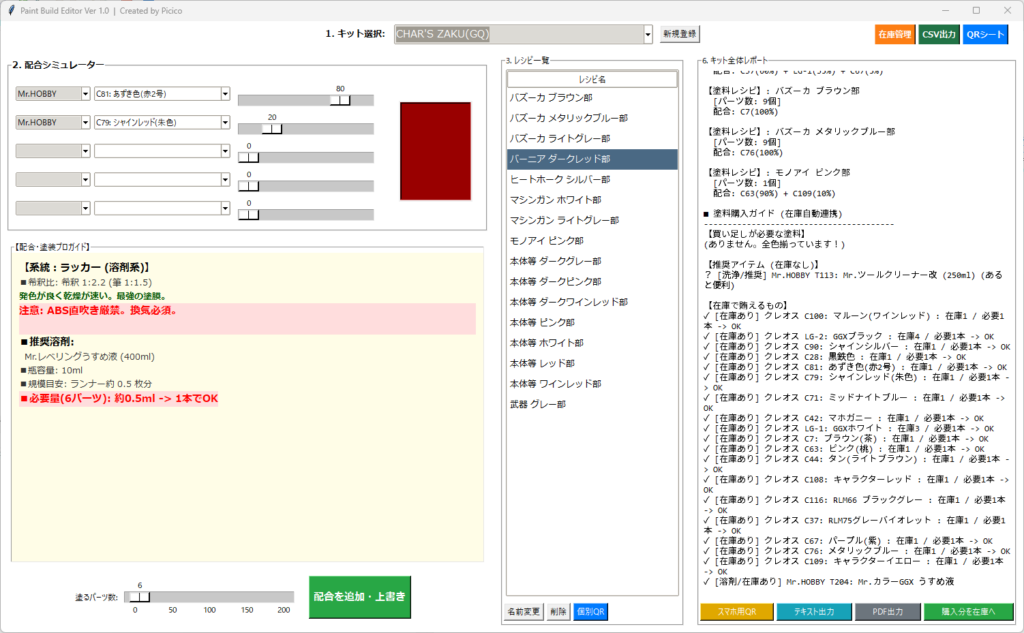 が一気に使えるようになります。好きな塗料を選び、組み合わせ、ダメな組み合わせは警告が出る。プラモデルが好きな方なら、「ああ、これね」と分かってもらえる内容かな、と思っています。